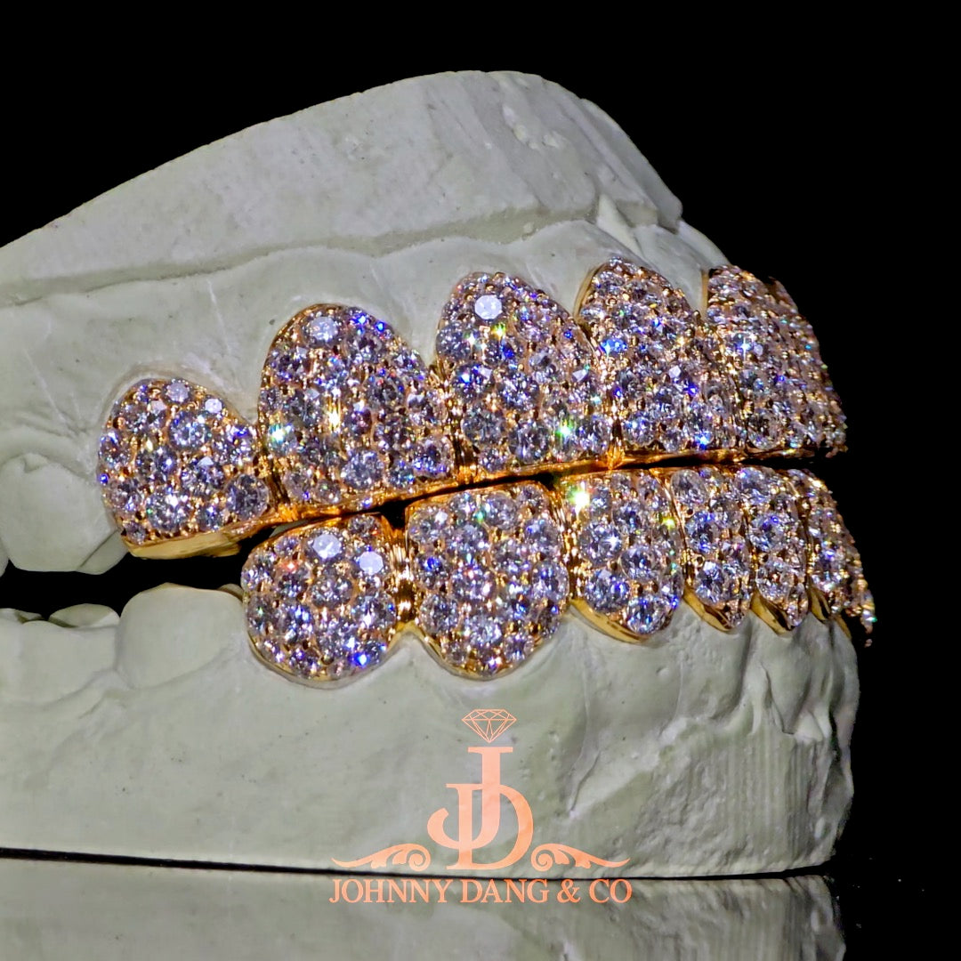 Step into the spotlight with the Big Boy Honeycomb (BBH) Grillz – a bold, custom-designed set featuring our iconic honeycomb setting, handcrafted to perfection. The "BB" derived from the larger size stones "6 Pointers" where the diamonds range from 0.01 to 0.06 carats, giving every smile unmatched brilliance and depth. The BBH set delivers a powerful statement of luxury and precision—fit for royalty, made for the streets. The pullout grill does not require dental work and can be purchased remotely.