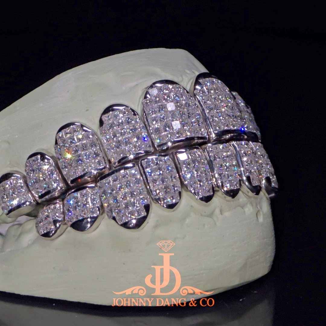 Flawless Princess Cut Invisible Set Grillz featuring a seamless, high-end look with perfectly aligned princess-cut diamonds that create a continuous surface of brilliance. This luxury design delivers maximum sparkle and refined sophistication, ideal for those who want to showcase a bold yet elegant statement.