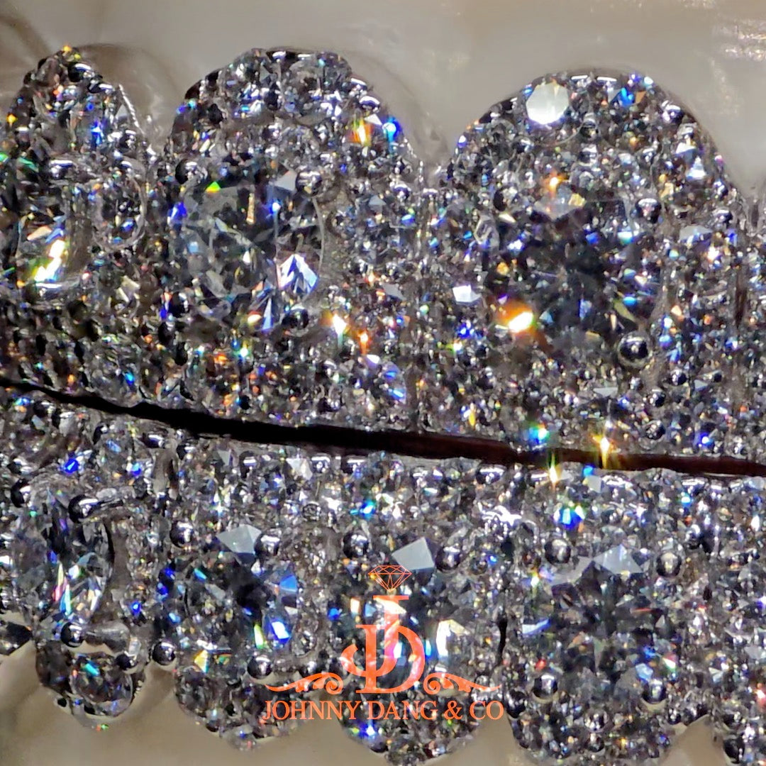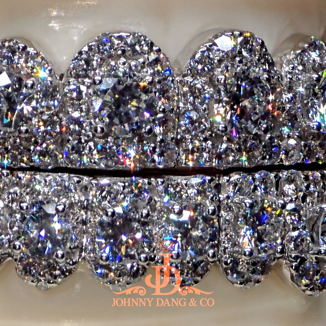 The Honeymoon® Set Grillz is Johnny Dang’s signature statement piece—an iconic blend of bold elegance and luxury. Each tooth features a dazzling honeycomb diamond layout crowned with a prominent center stone, creating a layered brilliance that instantly draws attention. Designed to elevate the classic flooded look, the large stones add dimension and drama, making this set a standout in any collection. Worn by celebrities like Megan Thee Stallion, FunnyMike, Finesse2Tymes, Bossman Dlow, and Kodak Black, the Honeymoon Set delivers an unforgettable shine that defines high-end custom jewelry.